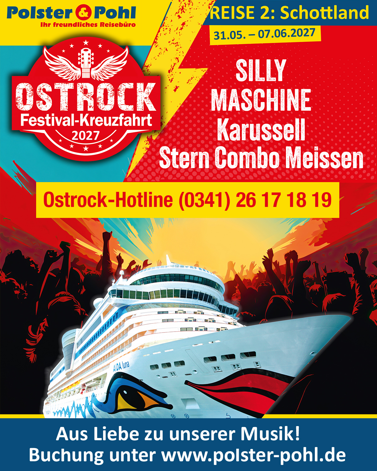 Wir sind absolut happy, vom 31. Mai bis zum 7. Juni 2027 gemeinsam mit Euch und unserem Partner „Polster & Pohl“ in See stechen zu können, neben uns werden auch SILLY, MASCHINE und KARUSSELL mit an Bord sein!